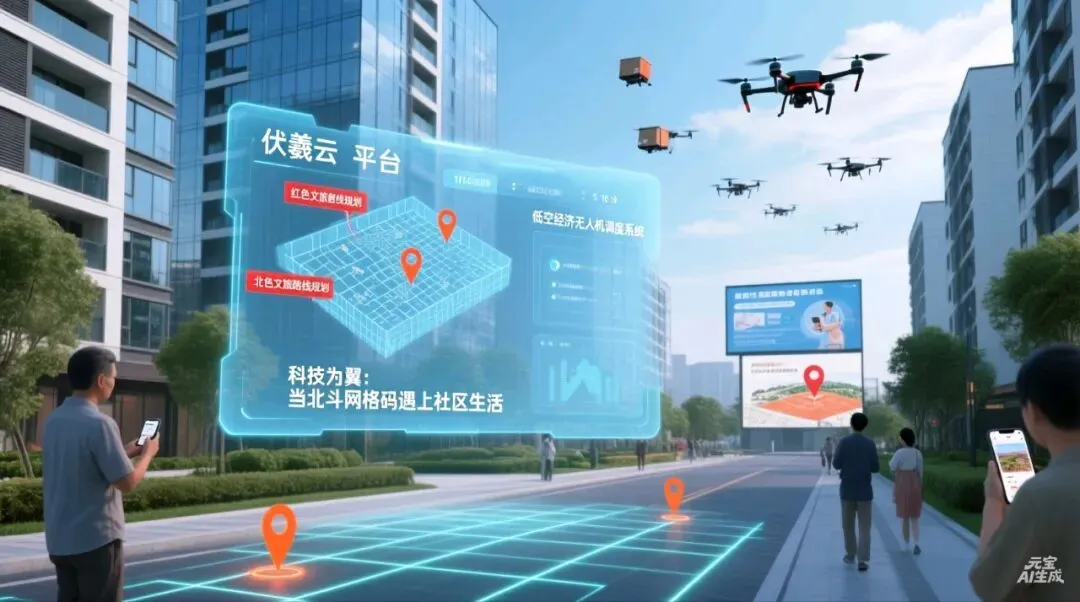 “伏羲云”作为平台的技术底座,其核心价值在于将前沿的北斗网格码技术应用于日常生活场景。这项技术不仅为“低空经济”提供了精准的空域管理支持,让无人机配送、空中巡检成为可能,更通过三维立体的位置服务,为“红色文旅”带来了沉浸式的数字体验。