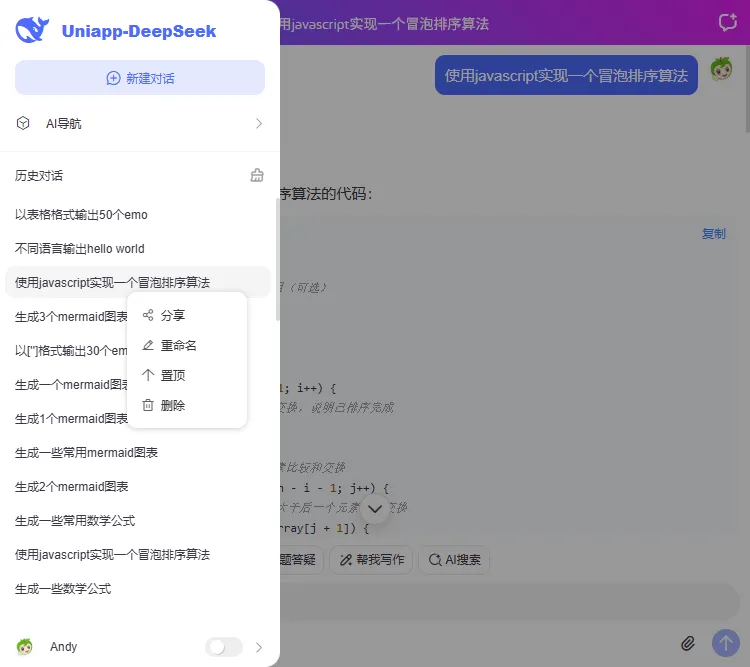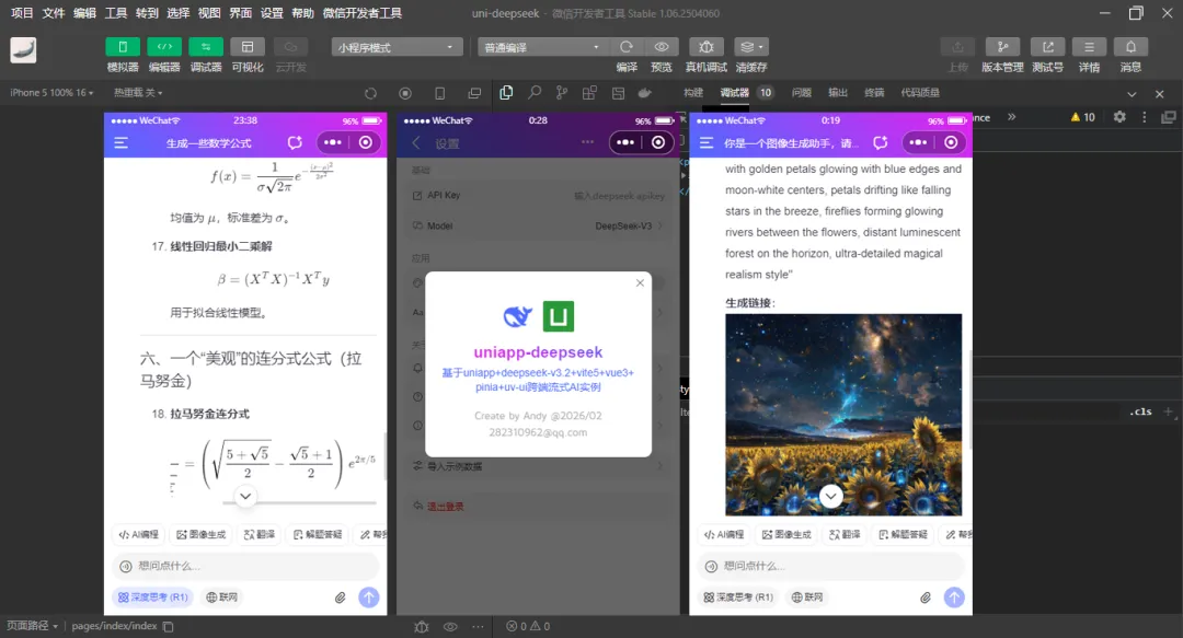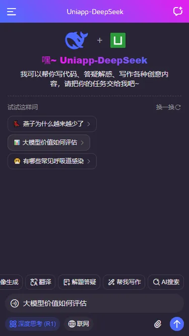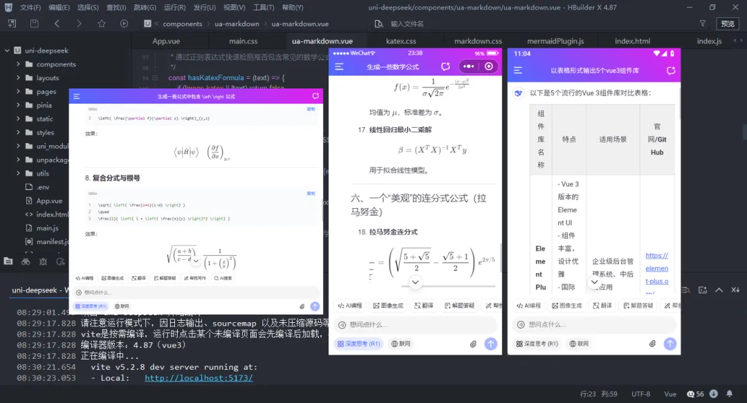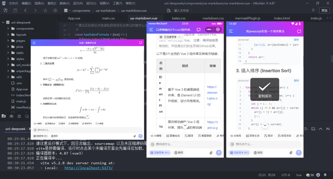 uni-vue3-deepseek提供浅色+深色主题、新增深度思考链、复制代码、katex数学公式、链接跳转、图片预览等功能。支持运行到h5+小程序+安卓端