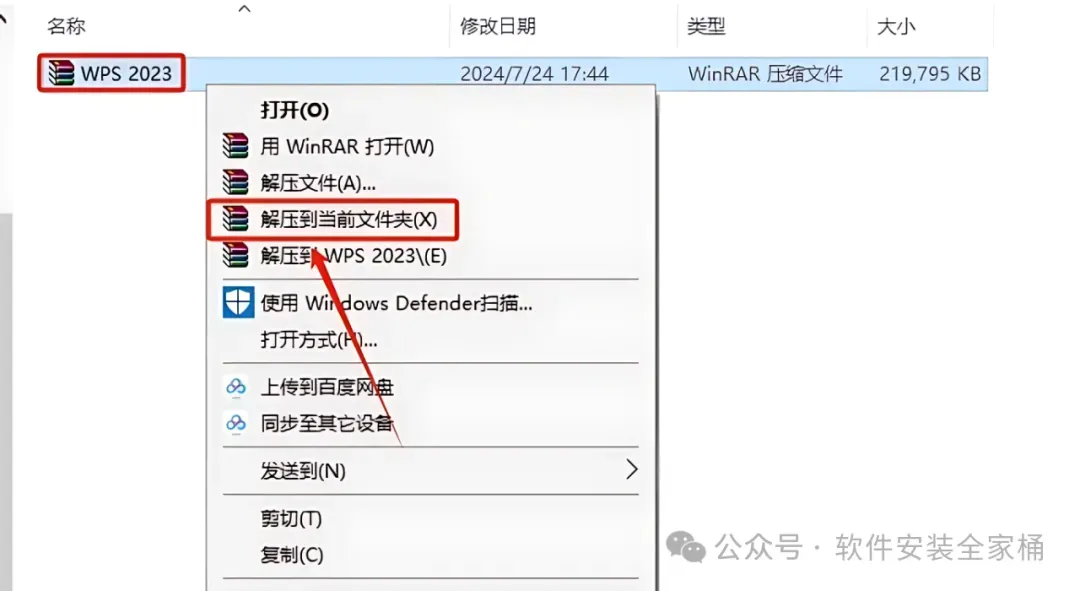 1.打开下载好的wps安装包,鼠标右击压缩包选择【解压到当前文件夹】。