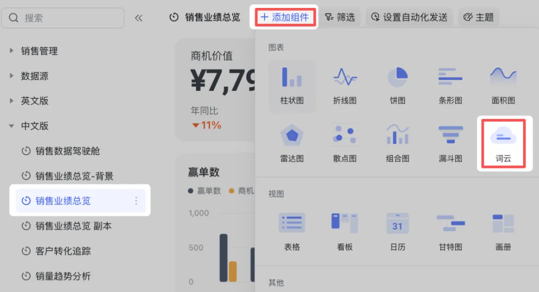 点击上方的 + 添加组件,在图表分类下选择 词云 组件。
