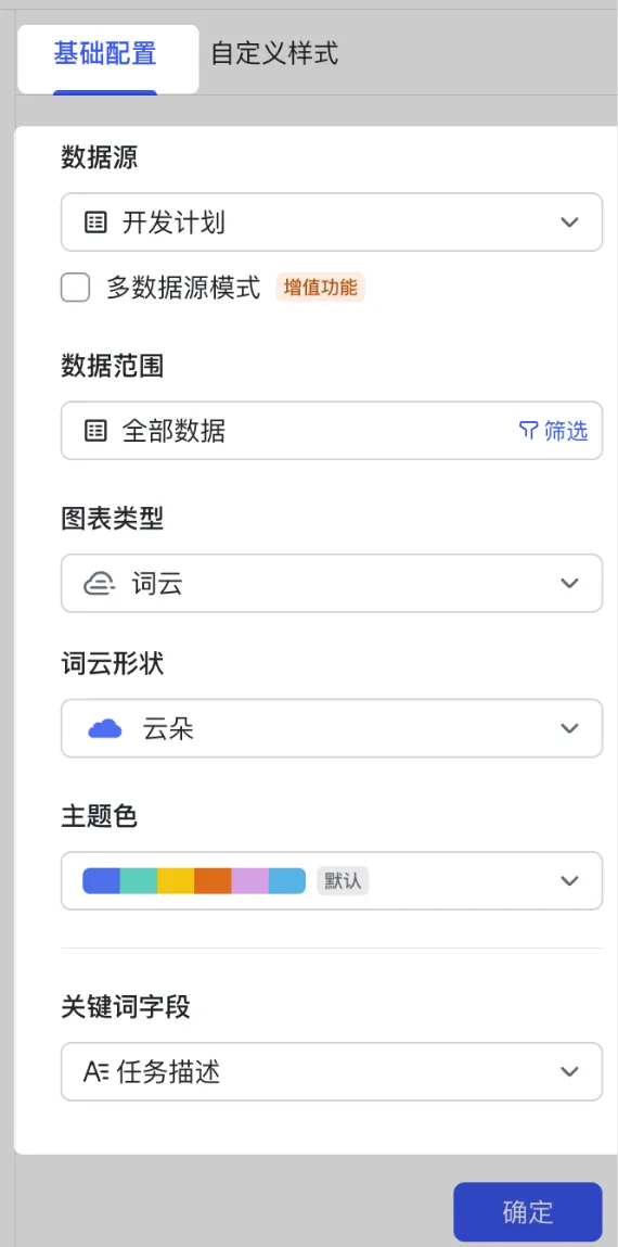 完成上述配置后,点击右下角的 确定,即可将该词云图表添加到仪表盘中。