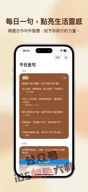 【名言金句 – 每日心靈充電站,點亮生活微光】一款每天陪伴的金句App,收获一句暖心鼓励,界面简洁清爽,支持自定义添加与分类管理金句。