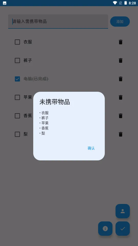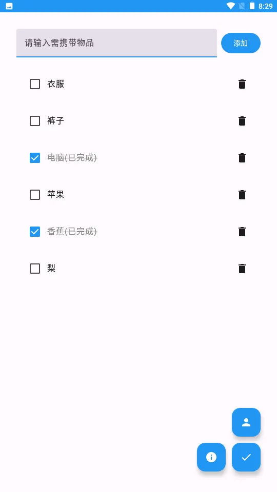 最近抽时间整了一个“出行清单”的安卓APP,该APP主要用来记录出行需要携带的物品。如果确认已携带,就进行勾选完成,整个APP使用起来比较清爽。整个安装包只有6M,安装完之后,也仅仅占用40多M的空间,非常小巧。APP为单机版应用,没有网络功能,不会收集用户任何信息。界面也比较干净,没有广告的骚扰之苦。