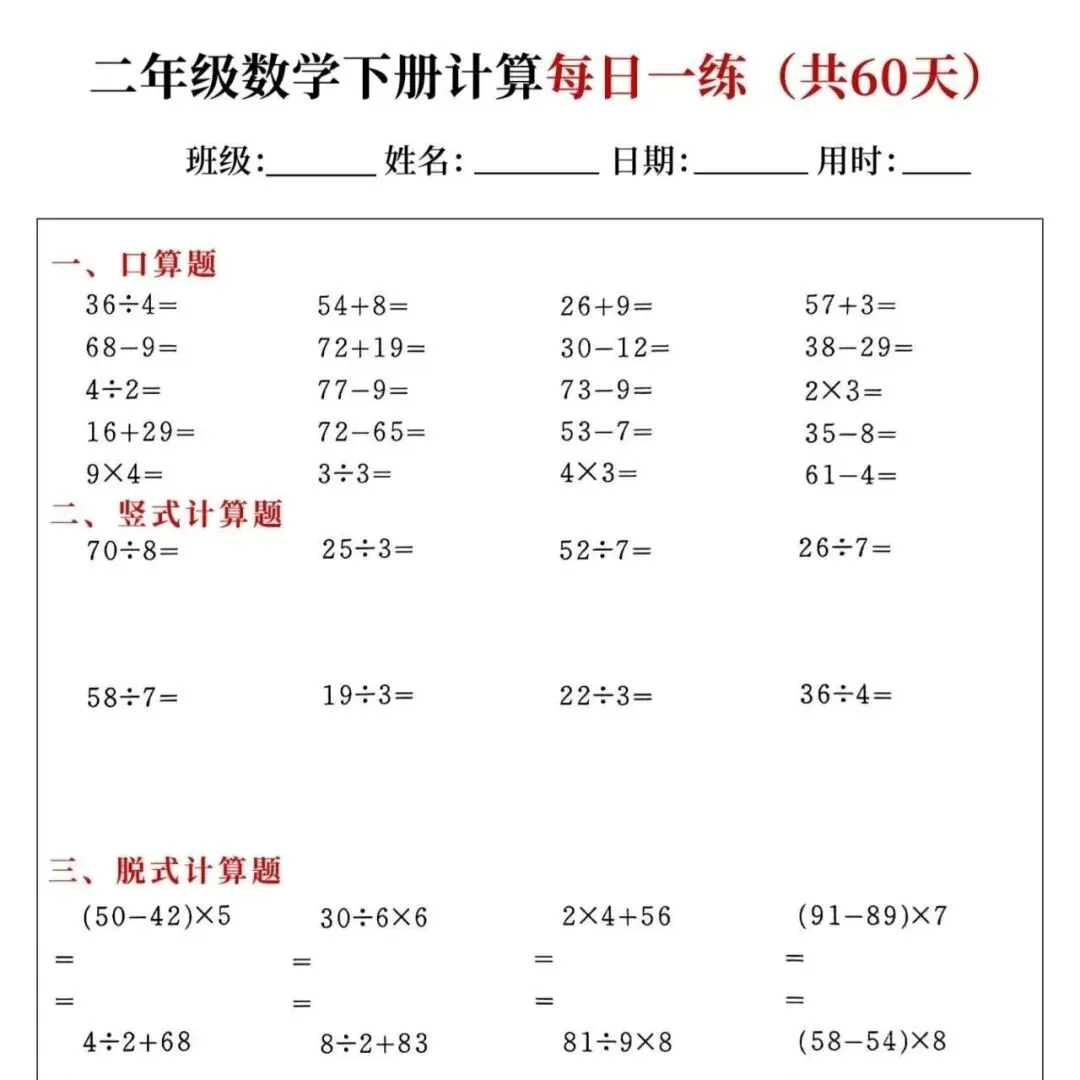 大家好,今天为大家分享一套专为2026年春季学期二年级孩子准备的人教版下册数学计算题专项训练资料。这套资料内容全面,包含每日一练,旨在帮助孩子系统性地提升计算能力,让数学学习更轻松。
