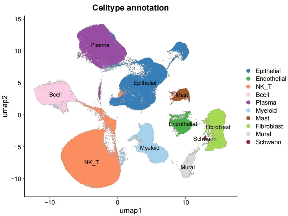 DimPlot(sce.all, reduction = "umap.integrated", group.by = c('CellType'), label = TRUE, cols = clusters_cols) + labs(x = 'umap1', y = 'umap2', title = 'Celltype annotation') -> p.umapp.umap <- p.umap %>% ggrastr::rasterise(dpi = 300) p.umap