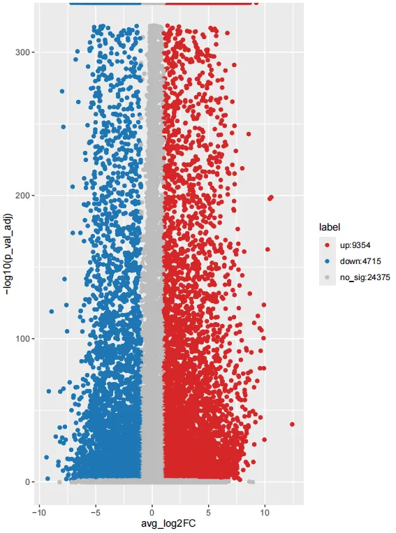 Epi_DEGs <- FindMarkers(sce.all,ident.1 = 'Epithelial',only.pos = F,logfc.threshold =0,min.pct = 0)# 设置logfc.threshold =0,min.pct = 0将所有基因的差异分析结果返回dim(Epi_DEGs)# 38444 5Epi_DEGs$label <- ifelse(Epi_DEGs$p_val_adj<0.05&abs(Epi_DEGs$avg_log2FC)>1,ifelse(Epi_DEGs$avg_log2FC>0,"up","down"),"no")Epi_DEGs$label <- factor(Epi_DEGs$label,levels = c("up","down","no"))table(Epi_DEGs$label)up_label <- paste0("up:",table(Epi_DEGs$label)["up"])down_label <- paste0("down:",table(Epi_DEGs$label)["down"])no_label <- paste0("no_sig:",table(Epi_DEGs$label)["no"])ggplot(Epi_DEGs)+geom_point(aes(avg_log2FC,-log10(p_val_adj),color=label))+ scale_color_manual(values = c("up"="#d62728","down"="#1f77b4","no"="grey"), labels=c(up_label,down_label,no_label)) -> p