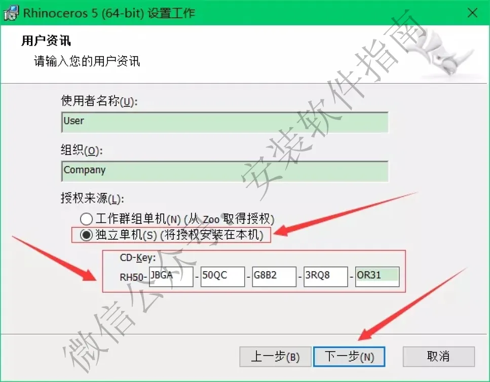 5、使用者名称和组织这两栏可以任意填写,在授权来源一栏,选择“独立单机” 并输入RHINO5.0的CD-KEY(序列号):JBGA-50QC-G8B2-3RQ8-OR31。点下一步。