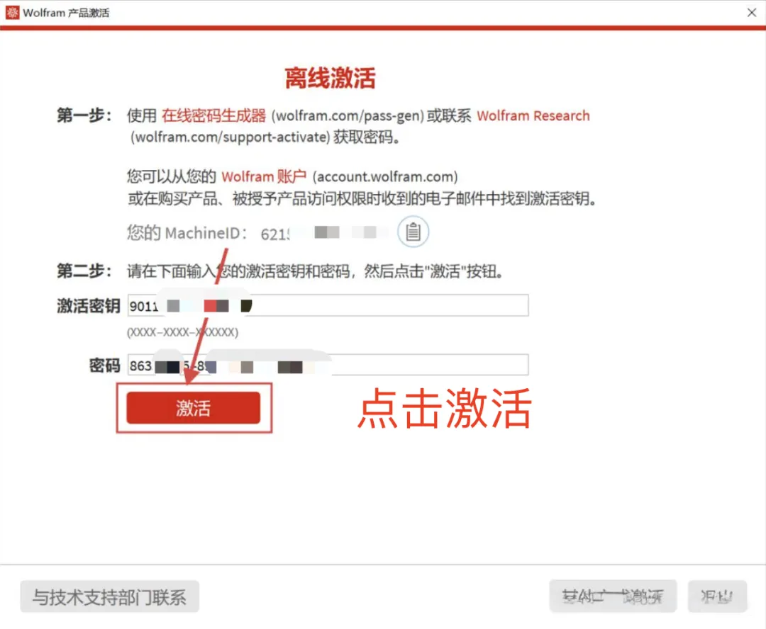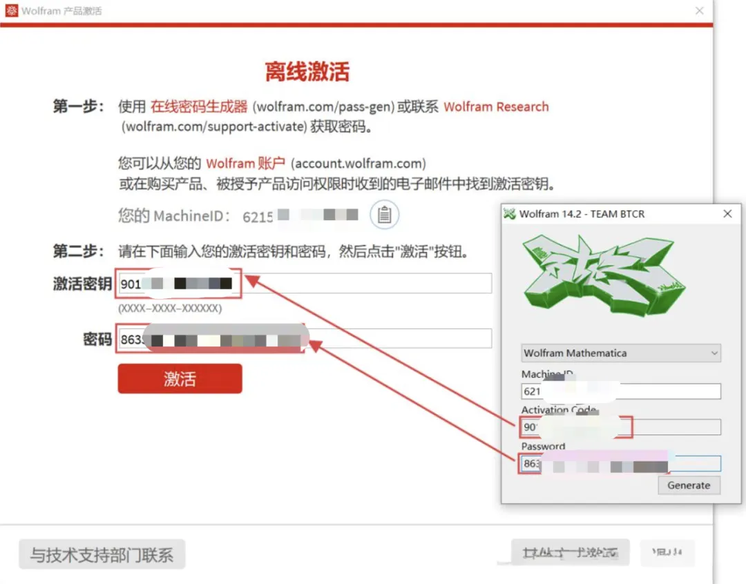 6、激活工具生成的密钥、密码,分别复制到【激活密钥】和【密码】输入框中,对号入座的复制。
