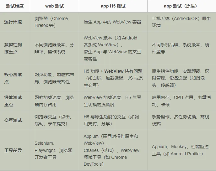 app H5 测试:是混合 App 测试的核心环节,兼具 web 测试的技术和 app 测试的环境适配要求。