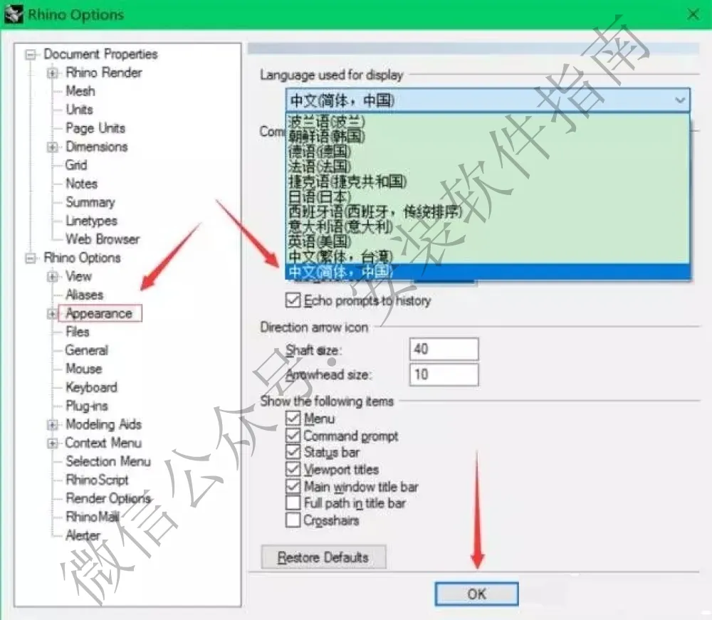 22.选择“Appearance”右边的“Language used for display”项,选择“中文(中国)”,点OK