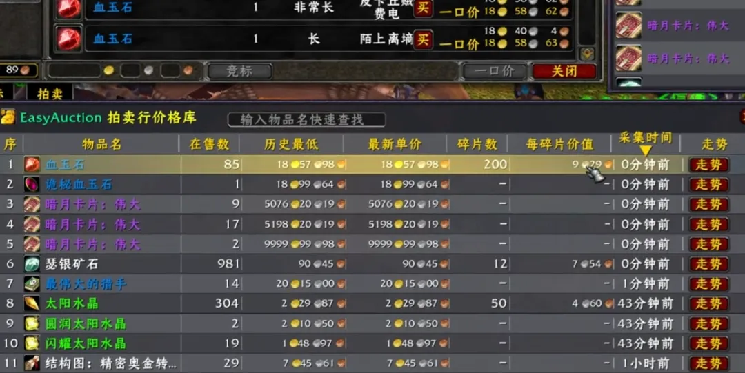现在只需要一个插件全部搞定,它能直接告诉你当前材料价值,泰坦碎片的价格波动,今天什么价,昨天什么价,上周什么价,全都记录得明明白白。就拿眼下热门的血域石来说,它需要两个泰坦狱镜兑换,相当于200个泰坦碎片,插件直接算出每个碎片现值九银二十九铜。