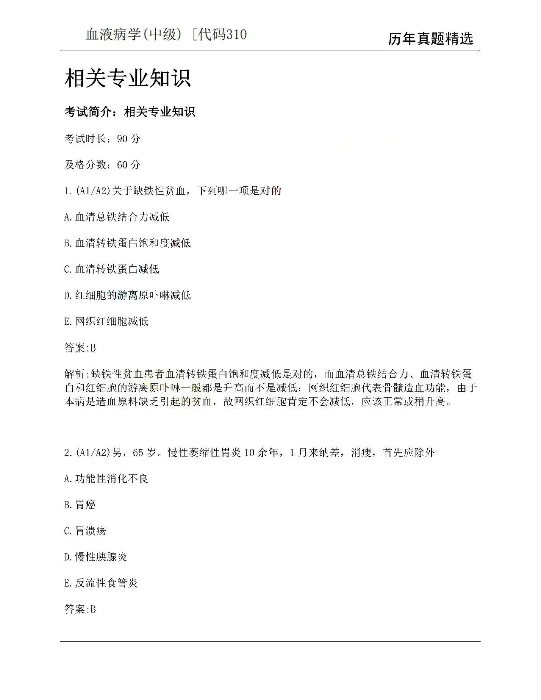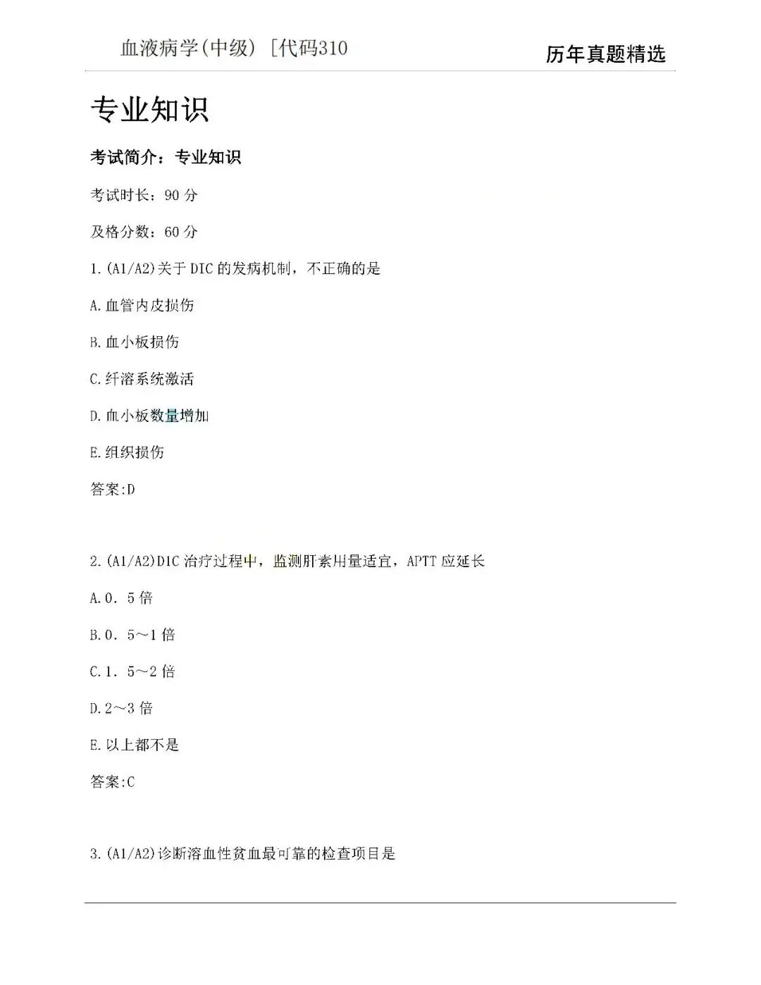 五、血液病学中级(310)历年真题【历年真题—真题是对考试考点、难度的真实反映,先过一遍历年真题,了解考情和考点,卫生职称往往会存在历年真题重现,考生重点把握】