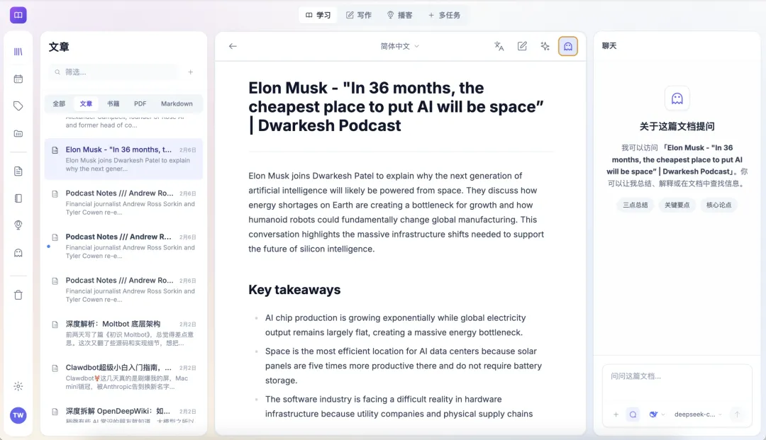 — 深度阅读 + AI 辅助笔记。在阅读的同时可以标注、提问、生成要点。适合学术论文、深度长文。