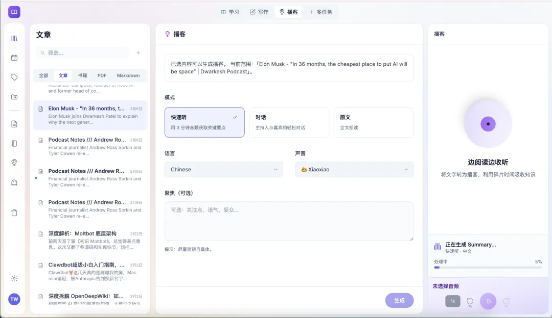 把长文变成播客,通勤路上也能消化积累的阅读清单。