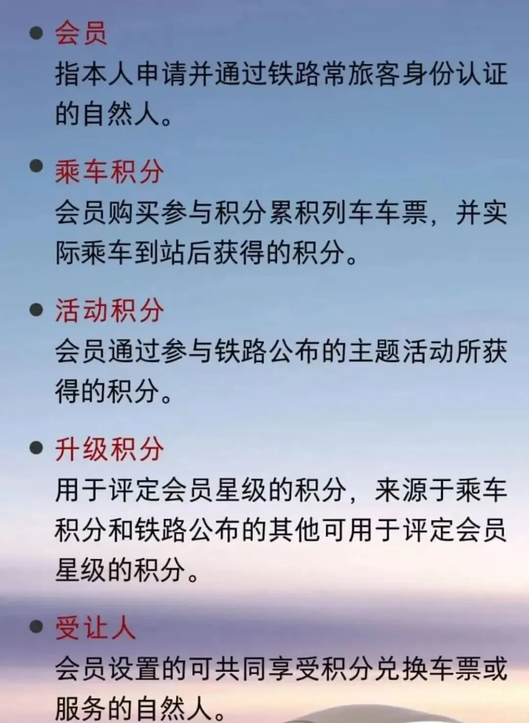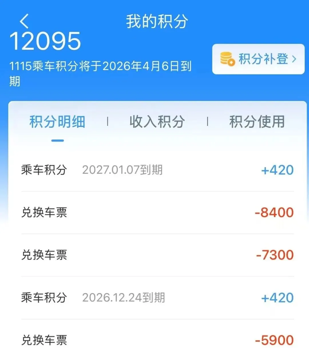 首先一定要注册成为铁路会员,可以享受购买车票累积乘车积分,乘车积分满10000分就可以用积分兑换车票的权益了,同时如果是一般和家人一起出去,那么提前添加“积分受让人”,这样就可以通过自己的账号同时兑换多个人的积分。积分受让人在添加成功后60天(含当天)后生效期,所以要提前添加,最多添加8人。积分规则:普通标准会员乘车积分=票面价格*5,积分以“分”为单位;年满60周岁会员积分=票面价格*15;14-28岁会员购买非学生票积分=票面价格*10;也就是对老人和学生年龄段没有购买学生票的享受的乘车积分高。会员帐户积分首次累积到10000分即可用于兑换车票,所以,可以根据情况集中一个会员帐户订票。凡是有“兑”字的列次均可用积分兑换车票,给各位看一下我的积分积累及兑换。
