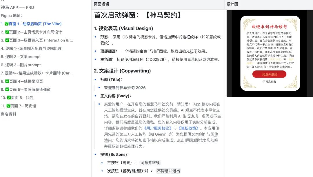 确定了名字和功能,接下来就是产品经理的老本行——写 PRD。理论上说,这种小项目搞个脑图就够了,但为了验证整个流程的闭环,我还是让 AI 按照 PRD 格式输出了一份完整的文档。结果挺意外的,AI 写的 PRD 竟然比我们这些偶尔想“偷懒”的人写得好多了:视觉要求、功能逻辑、甚至内置文案全部干进去了(当然,文案部分我们最后还是人工把关修改了一波)。