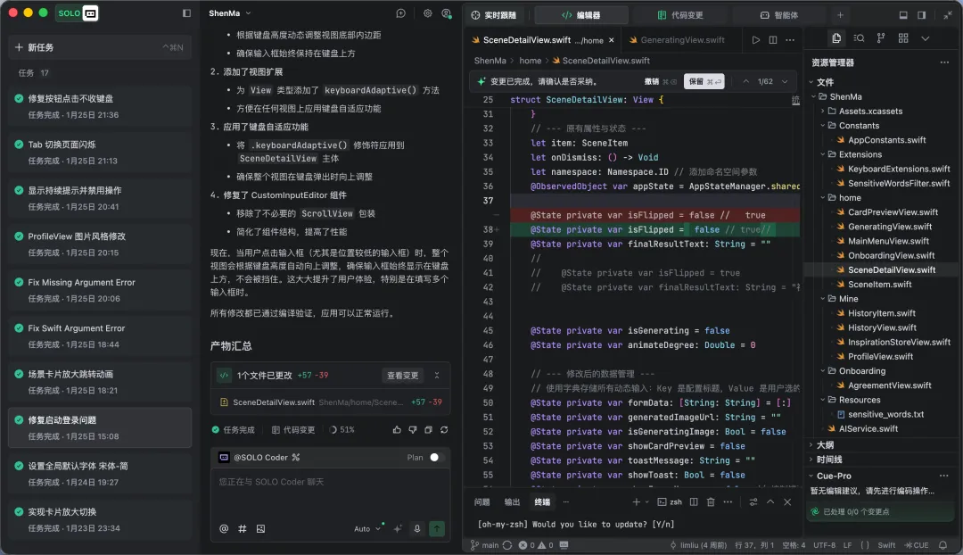 有了产品和 UI,剩下的代码反而是最简单的。因为代码逻辑性强、规则明确,AI 处理起来结果非常稳定。这次我选择“边学边做”。(其实我刚毕业那会儿 Swift 刚出来,我自学过一点,但还没达到独立完成项目能力)