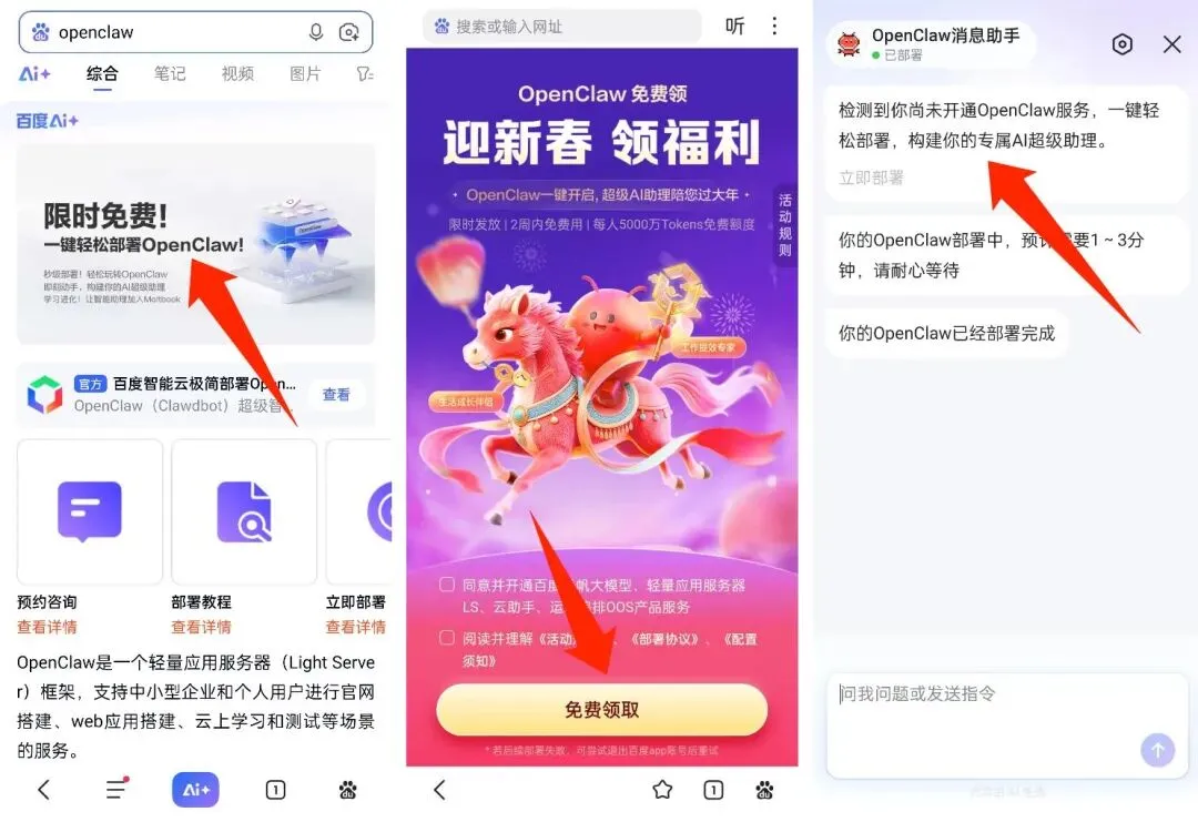 具体方法:打开百度 App, 在搜索框里输入:openclaw ,然后搜索即可,就会显示一键部署的开通页面。