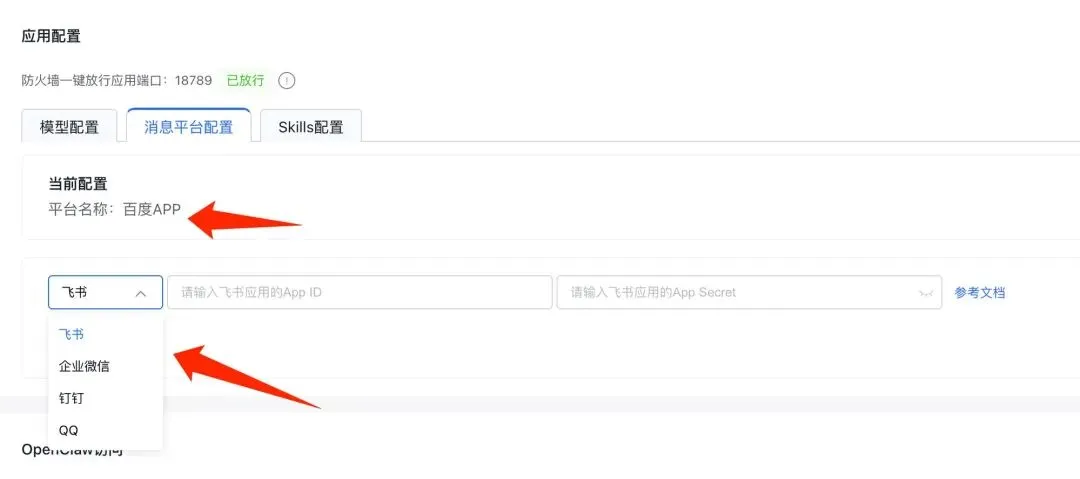 模型这里选择官方推荐的即可,消息平台配置就是配置接收和发送消息的机器人,可以是百度 App ,也可以是飞书、QQ 和企业微信,就像是国外 OpenClaw 使用的是 Telegram 一样。