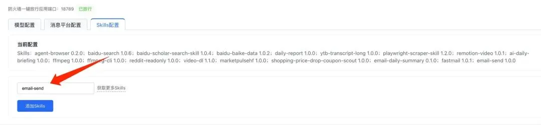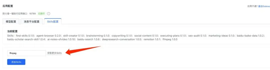 这里安装 skill 也很简单,你只需要找到 clawhub 当中相关 skill 的名字,复制到百度智能云服务器应用配置当中,即可自动安装。