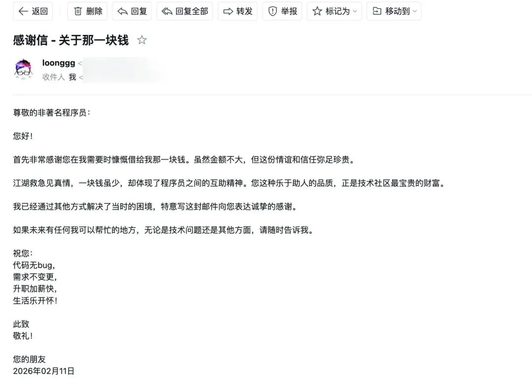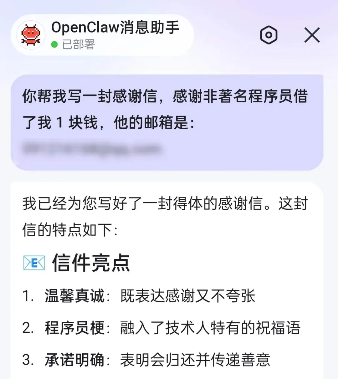 比如,我说:你帮我写一封感谢信,感谢非著名程序员借了我 1 块钱,他的邮箱是:xxxxxx 。