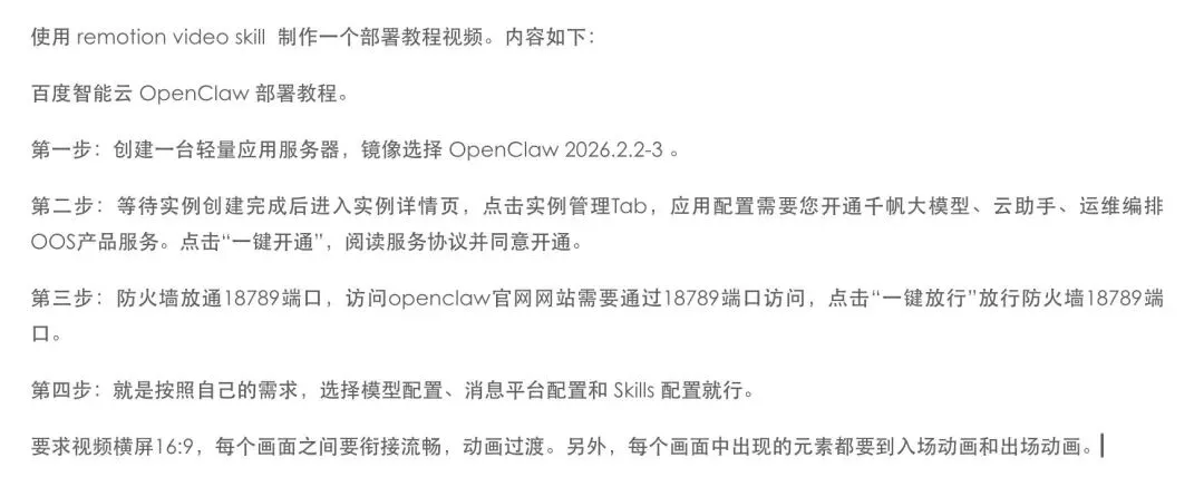 比如,我看百度智能云有一个部署教程文档,我提炼了一下,制作一个教程宣传视频,提示词如下: