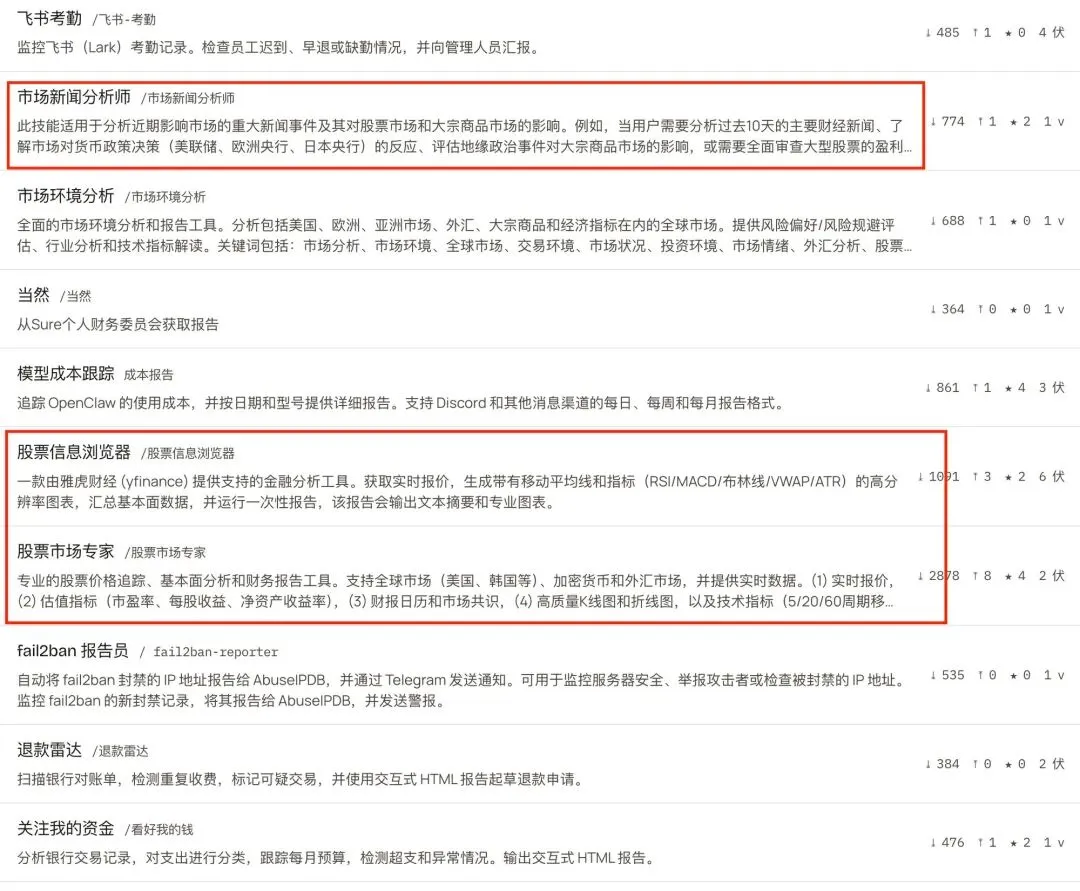 ClawHub 当中有成千上百个 Skill ,各种技能的都有,其实你只要接入相关的 Skill,配置上账号信息,接入 API ,就可以帮你干很多活,比如:接入飞书管理相关的账号,可以帮你管理考勤、打卡;接入股票分析等相关的 Skill ,可以实时帮你盯盘,发消息及时提醒。真的是实实在在能帮我们干活,挺好的,大家可以根据自己的需求去配置。