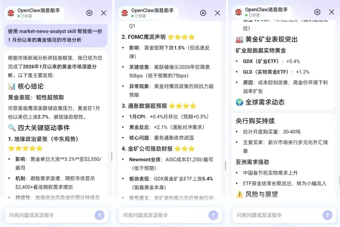 比如,如果你是市场金融相关行业的,可以做一些市场分析报告,里面有很多跟股票金融相关的技能,最近黄金比较火,比如,我说:帮我做一份 1 月份以来的黄金情况的市场分析。