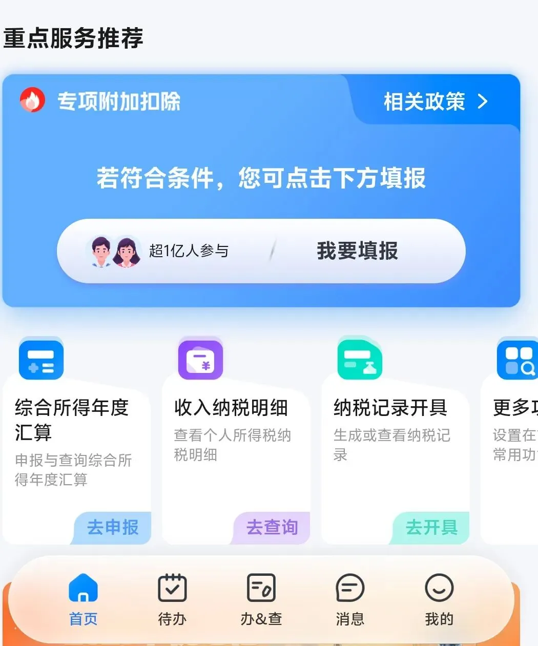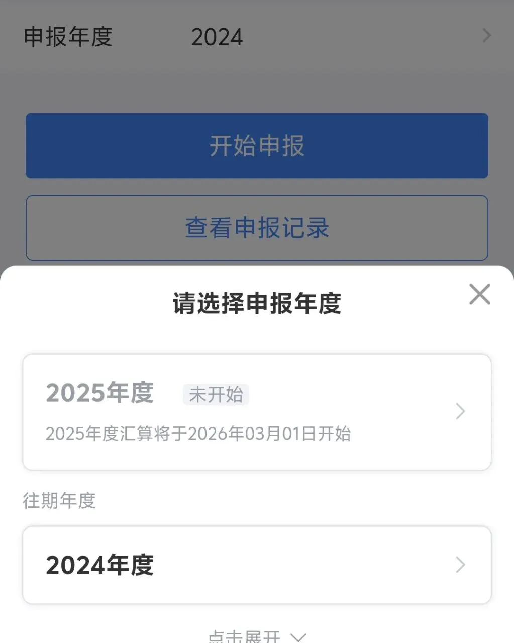 第三步:在首页点击“综合所得年度汇算”,选择需要汇算清缴的年份即可!注意:点进申报后需要查看总收入和专项附加扣除是否正确以免扣除额减少影响退税(不仅无法退税还可能补税)!