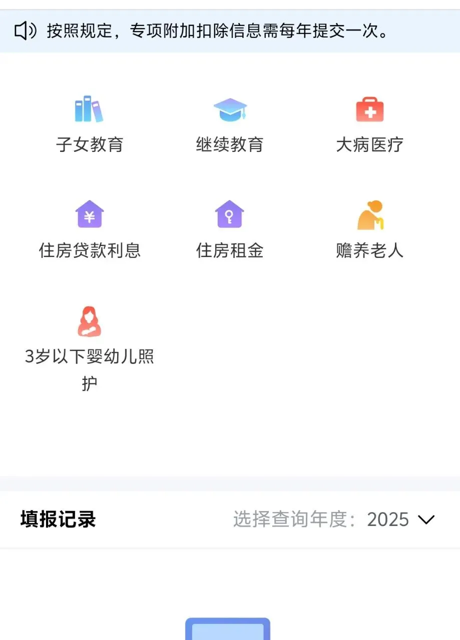 第二步:注册好之后可以在个税APP上进行个人所得税专项附加扣除的填写(如果有符合条件的话)。总共有7项专项附加扣除,分别是子女教育、继续教育、大病医疗、住房贷款利息、租房租金、赡养老人以及3岁以下婴幼儿照护。