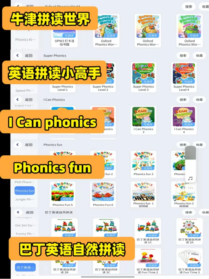 3、自然拼读:Oxford Phonics World,牛津树自然拼读,丽声自然拼读等。