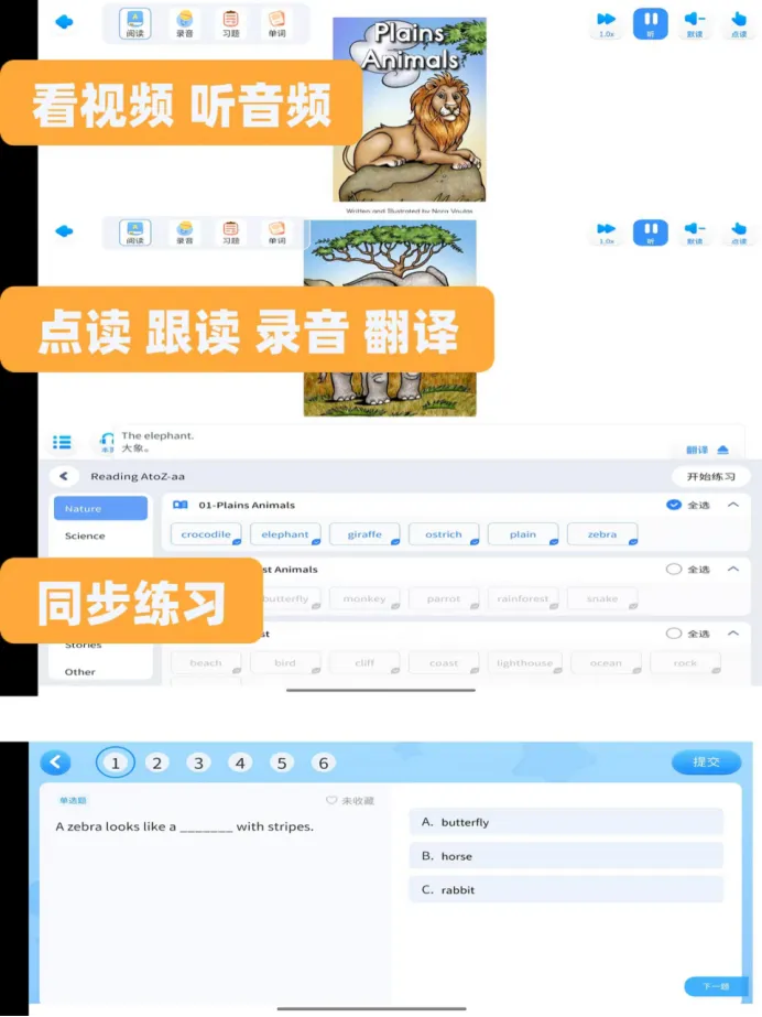 1、电子读物学习:看视频,听音频,点读,跟读测评,文本翻译