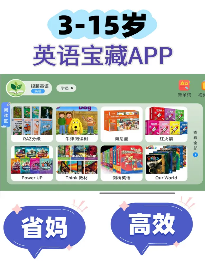 从孩子的英语启蒙到孩子高中,所有你会用到的资源,无论是启蒙的儿歌和绘本,动画片,还是各种分级阅读、桥梁书、章节书,各类原版教材、校内教材都涵盖了。帮您省去万元报班费。