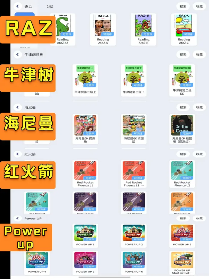 1、分级阅读: RAZ,牛津树,海尼曼,红火箭,大猫,兰登,丽声等