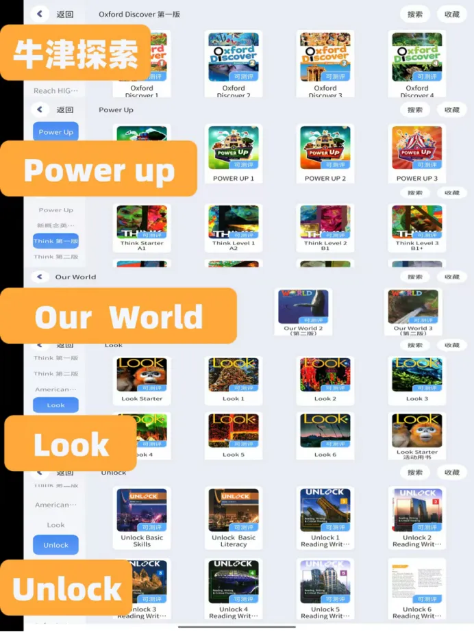 2、原版教材:Oxford Discover, Power Up,Think,Our World ,Look,Kid’s Box,Let’s Go,新概念等。
