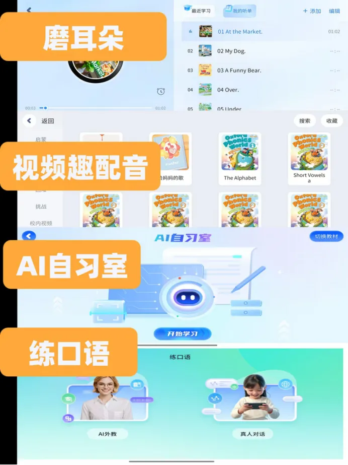 1、电子读物学习:看视频,听音频,点读,跟读测评,文本翻译