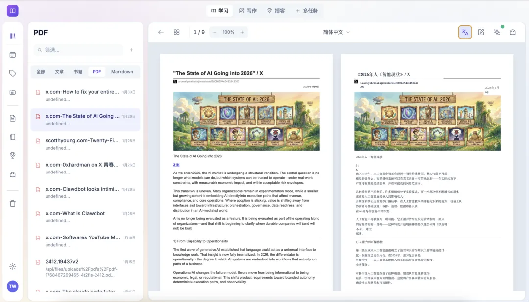 — 深度阅读 + AI 辅助笔记。在阅读的同时可以标注、提问、生成要点。适合学术论文、深度长文。