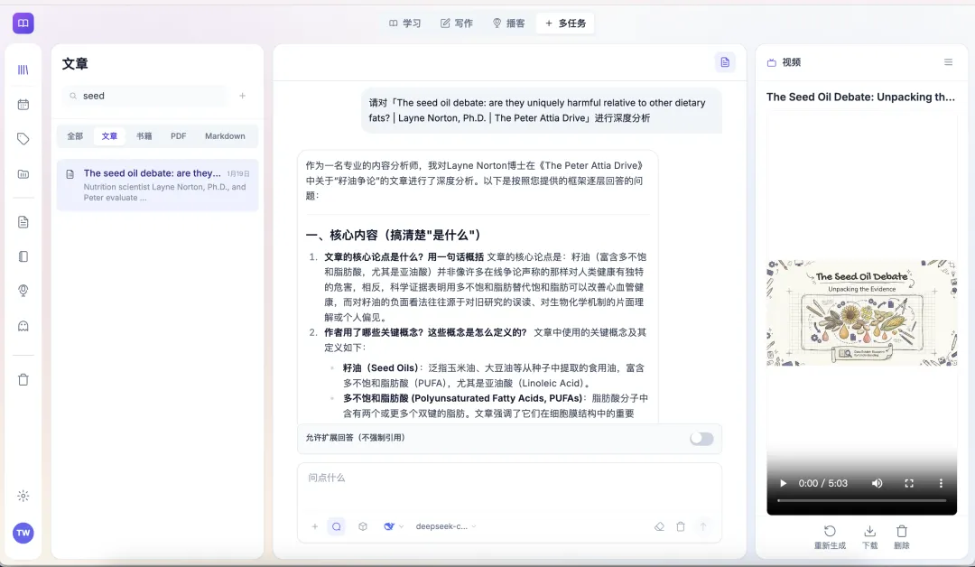 — 单篇或多篇内容的深度理解,可以生成midmap,ppt,视频讲解来帮助你理解和学习相应的知识,