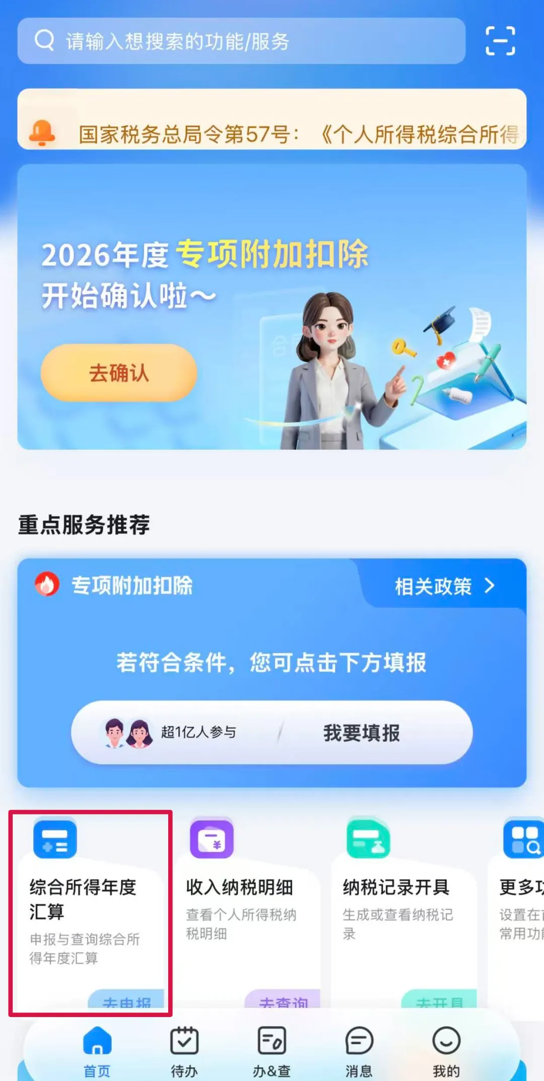 1.登录个人所得税APP,在【首页】点击左下方【综合所得年度汇算】。