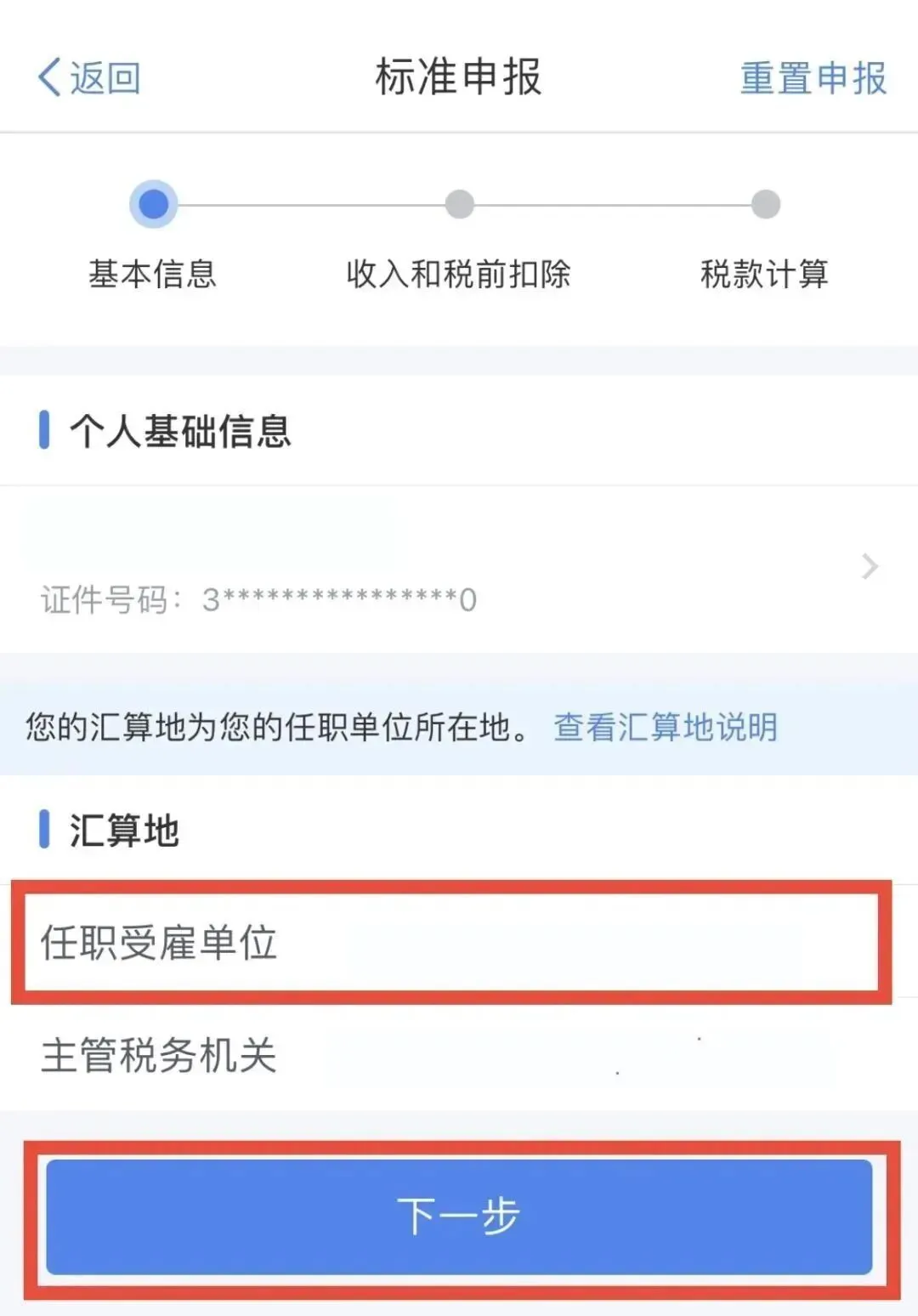 1.核对【个人基础信息】选择或确认【任职受雇单位】,点击【下一步】,没有任职受雇单位的,可选择主要收入来源地、户籍所在地或经常居住地。