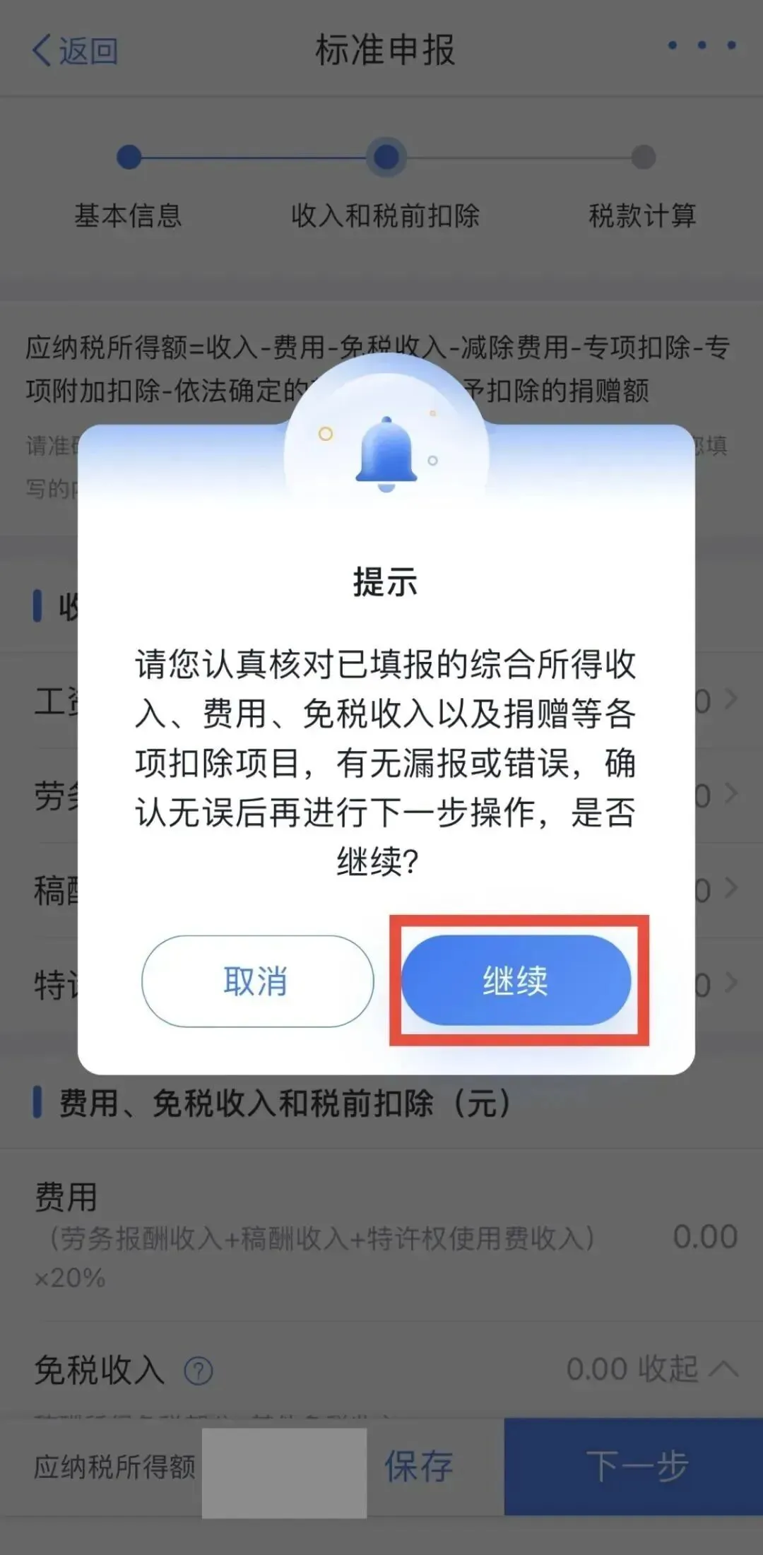 1.当您对收入、费用、免税收入和税前扣除等项目核对无误后,直接点击【下一步】进入税款计算界面。