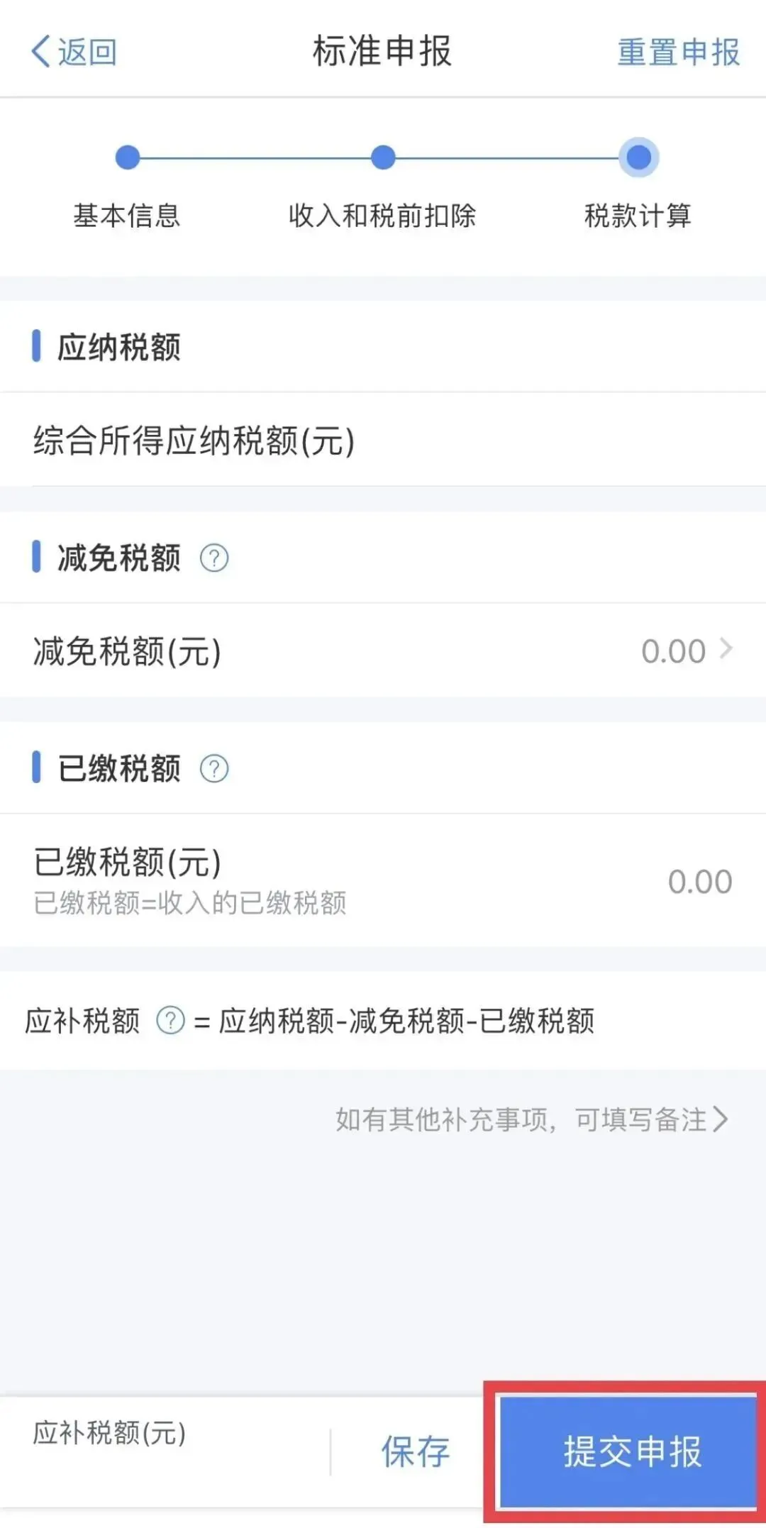 3.系统会自动计算出您的【应补税额】或【应退税额】,并在左下方显示: