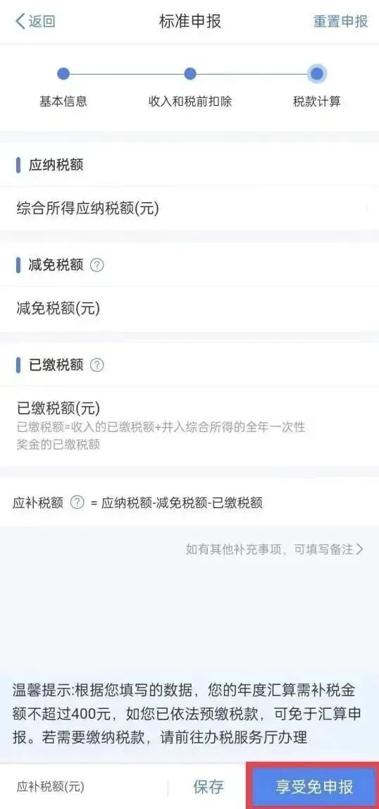 4.您如果需要补税,但年度综合所得收入不超过12万元,或者汇算需补金额不超过400元,且依法预缴税额的,如下图,可点击【享受免申报】。