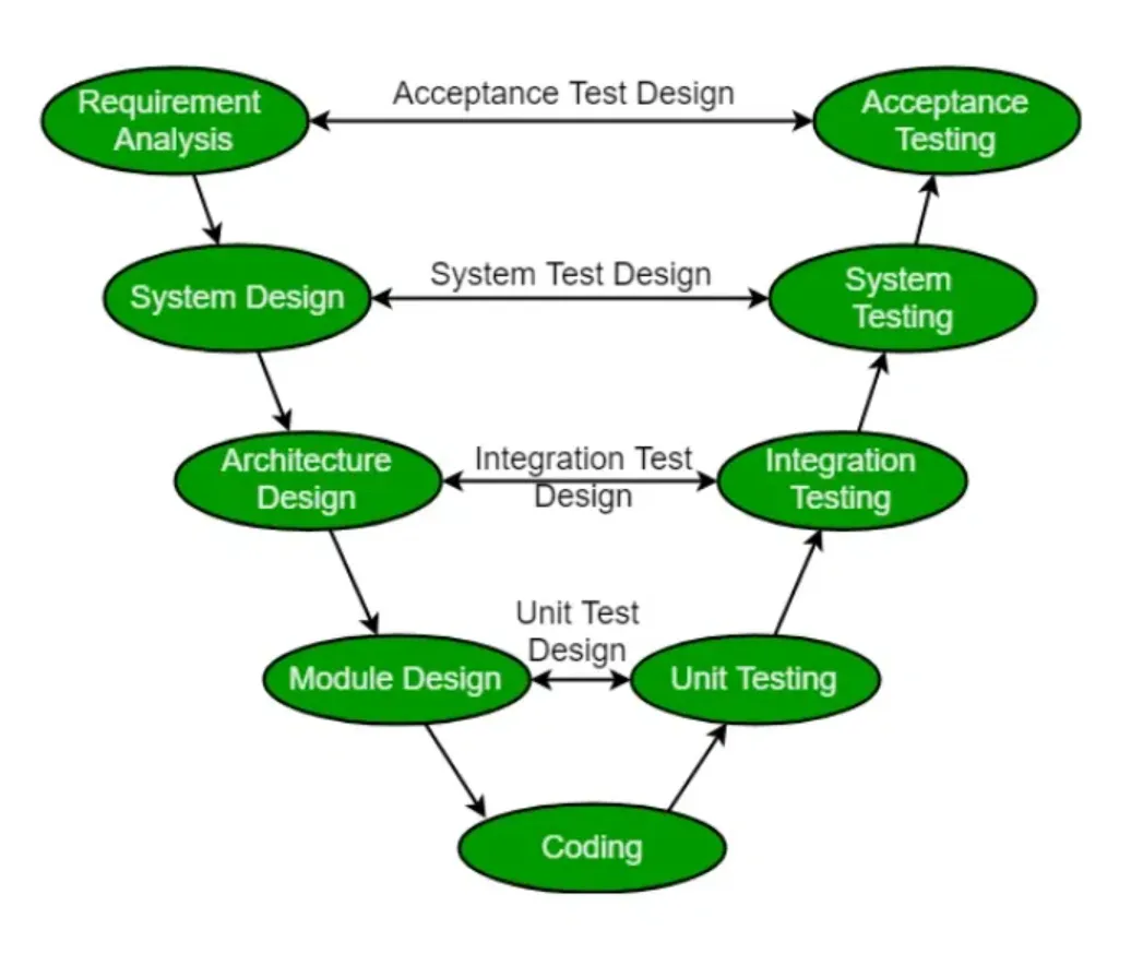 V 模型包含与开发流程的每个阶段相对应的测试阶段。通过确保测试和开发流程清晰地规划,这种清晰的映射有助于促进软件工程系统化、有序化。