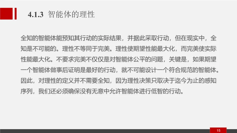 构建理性智能体需先明确任务环境,通过PEAS框架(性能、环境、执行器、传感器)进行系统描述,同时需考量环境的可观测性、确定性、动态性等多重属性。