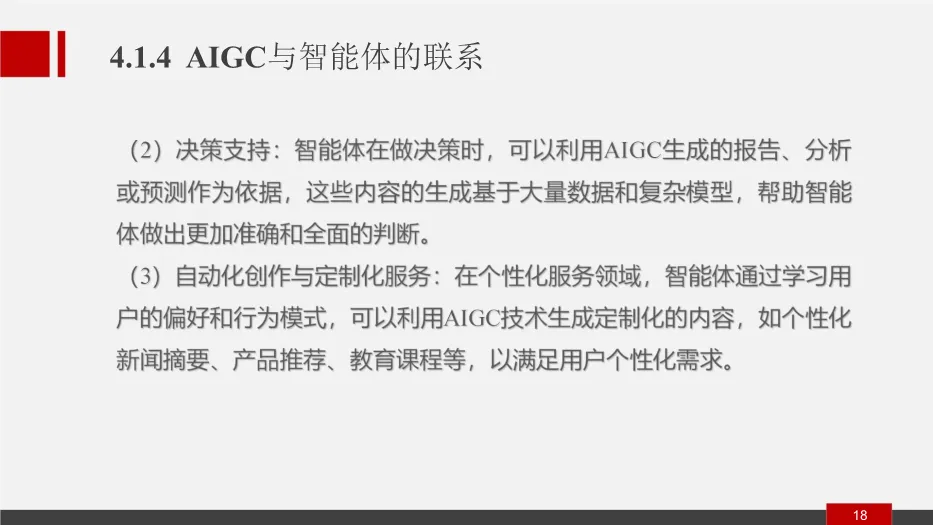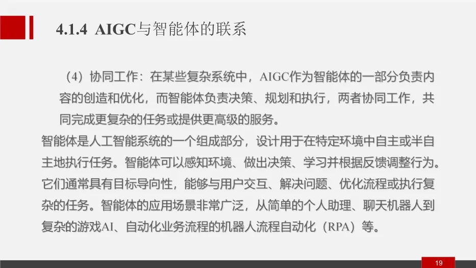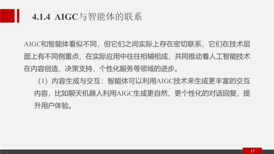 AIGC与智能体在技术层面相互补充,在实际应用中协同发力,AIGC为智能体提供丰富的交互内容与决策依据,智能体则负责决策、规划与执行,共同推动人工智能在多领域的创新应用。