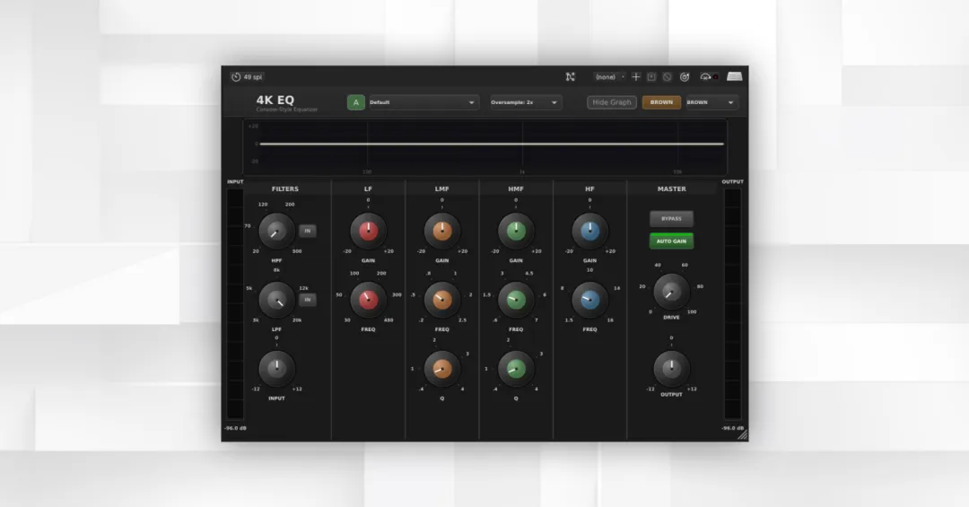 4K-EQ 包含两种可选工作模式,对应这两种控制台版本。Brown 模式基于 E 系列设计,特点是更宽广的均衡曲线、固定 Q 值搁架滤波,以及以二次谐波为主的饱和特性。Black 模式则反映 G 系列设计,提供更紧致的比例 Q 响应、更明显的三次谐波成分,并允许在低频和高频频段之间切换钟形(Bell)与搁架(Shelf)模式。