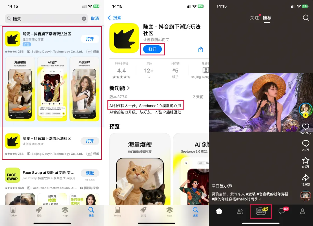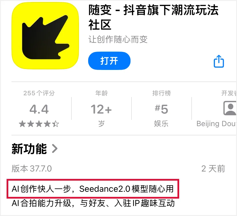 直到昨晚,我发现抖音居然悄悄摸摸上线了一款新的应用,叫做随变,而且写着Seedance2.0模型随心用。