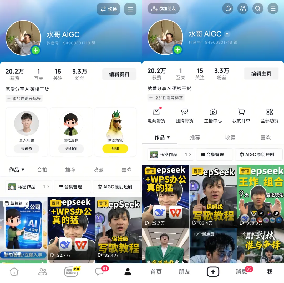 所以你会发现,随变是用抖音号登陆的,而且会同步抖音的所有内容和互动数据,甚至可以直接把生成好的AI视频快速同步到抖音账号上。