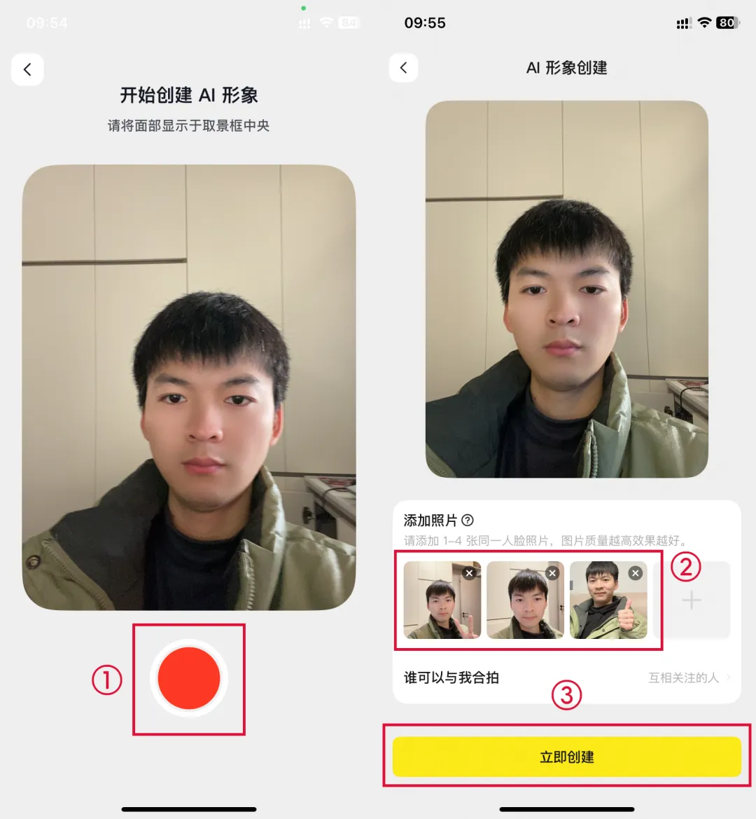 人脸视频录制完之后,还会要求我们上传1到4张自己的自拍照,我也是随手上传了三张上去,接着点击立即创建就可以了。